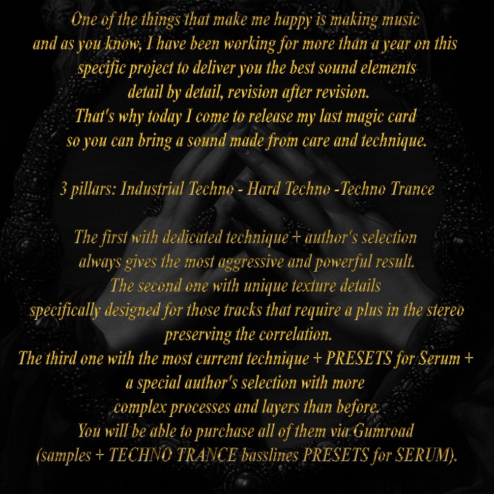 You will be able to purchase all of them HERE on GUMROAD (samples + TECHNO TRANCE basslines SERUM presets).